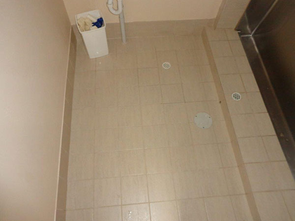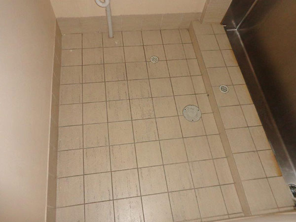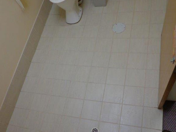 | Public bathroom with tiles and grout looking very dark and dirty |